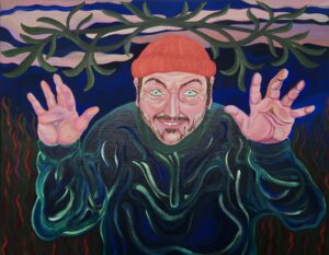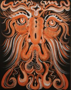 Dieren zoals de slang, maar ook de bok worden vaak in verbinding gebracht met het kwaad. De bok wordt wel als de voorloper van de duivel beschouwd; denk bijvoorbeeld aan Pan, de Griekse god van de natuur die de kop (inclusief horens) en poten van een bok en het bovenlichaam van een mens heeft. Carmen is gefascineerd door deze voorchristelijke vormen van de duivel, omdat daarin ook de speelse kant ervan naar voren komt. Het onverwacht, onvoorspelbare gedrag -het springen als een bok. In haar onderzoek naar de duivel kwam ze ook herhaaldelijk duivelbanners, oftewel in het Fries duvelbanners tegen. Duvelbanners waren vaak boeren die verder keken dan wat rationeel te verklaren is en daardoor als een soort magiërs werden beschouwd. Zij werden erbij gehaald bij ziekte om de boze geesten te verdrijven. Deze geesten verdrijven door ze bijvoorbeeld te laten schrikken met hun eigen beeld in de vorm van maskers. Eigenlijk te doen en te laten zien waar je zelf bang voor bent, vindt Carmen intrigerend omdat het wederom de komische kant van het kwaad benadrukt. Het schilderij Boogie Man belichaamd deze speelse kant van de duivel en brengt daarnaast de symmetrie van de wilgentakken en de open manier van schilderen, voor het eerst toegepast in de grotesken, samen. Boe!