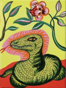 Het schilderen van de slang bijvoorbeeld, is in eerste instantie een manier om de residency in te luiden, later wordt er door Carmen betekenis aan gegeven en verbanden gelegd met het thematische onderzoek. Mensen gebruiken dierenmaskers en schrijven regelmatig in verhalen menselijke eigenschappen aan dieren toe. Derhalve vindt Carmen het opvallend hoe in de historische afbeeldingen van Adam en Eva de slang juist een vrouwenhoofd heeft en daarmee de maskerade is omgedraaid: het dier vermomt zich als mens. Vaak lijkt het vrouwenhoofd van de slang op het gezicht van Eva en is het alsof Eva in de spiegel kijkt. Zit het kwaad misschien wel in haarzelf? ‘Pas maar op als je in de spiegel kijkt want misschien zit joosje pek (de duivel) erachter!’ (Nie in de spiegel kieken, anders krieg j’n klap van joosje pek) In dit Zeeuws gezegde vond Carmen een verband tussen de duivel en de spiegel die haar ook tot de vraag leidde: Zit het kwaad in onszelf? Wat zie je als je in de ‘gehoornde’ spiegel kijkt?
