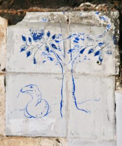 Vlak voordat Faust de duivel Mephisto in de beroemde tragedie van Johann Wolfgang van Goethe voor het eerst ontmoet, vraagt Faust of daadwerkelijk in ‘het begin het Woord’ was, zoals dat in de bijbel wordt gesteld. Nadat Faust ‘de geest’ en ‘de kracht’ als alternatieven heeft afgeschreven, komt hij tot de conclusie: In het begin was de daad! Zo ook voor Carmen Schabracq. Zij begon haar residency bij Kunsthuis SYB met het schilderen van een slang. Een voorstelling gebaseerd op die van een beschilderde tegel, aanwezig in het oude gedeelte van het gebouw. Weinig tegels zijn bewaard gebleven en de slangentegel is dan ook de enige die een dier afbeeldt, iets dat Carmen meteen aansprak. De slang is naast een boom afgebeeld wat bij haar associaties met het paradijs en de verdrijving van Adam en Eva opriep, en haar deed denken aan historische voorstellingen van het paradijs, waarbij de slang een vrouwenhoofd heeft.